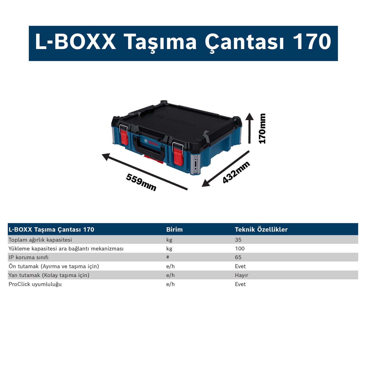 - L-BOXX Taşıma Arabası 170, ProClick ürünlerinin takılması için entegre alüminyum raylara sahiptir. Tüm L-BOXX Taşıma Çantası ürünleri, önceki standart L-BOXX’lar ile uyumludur.