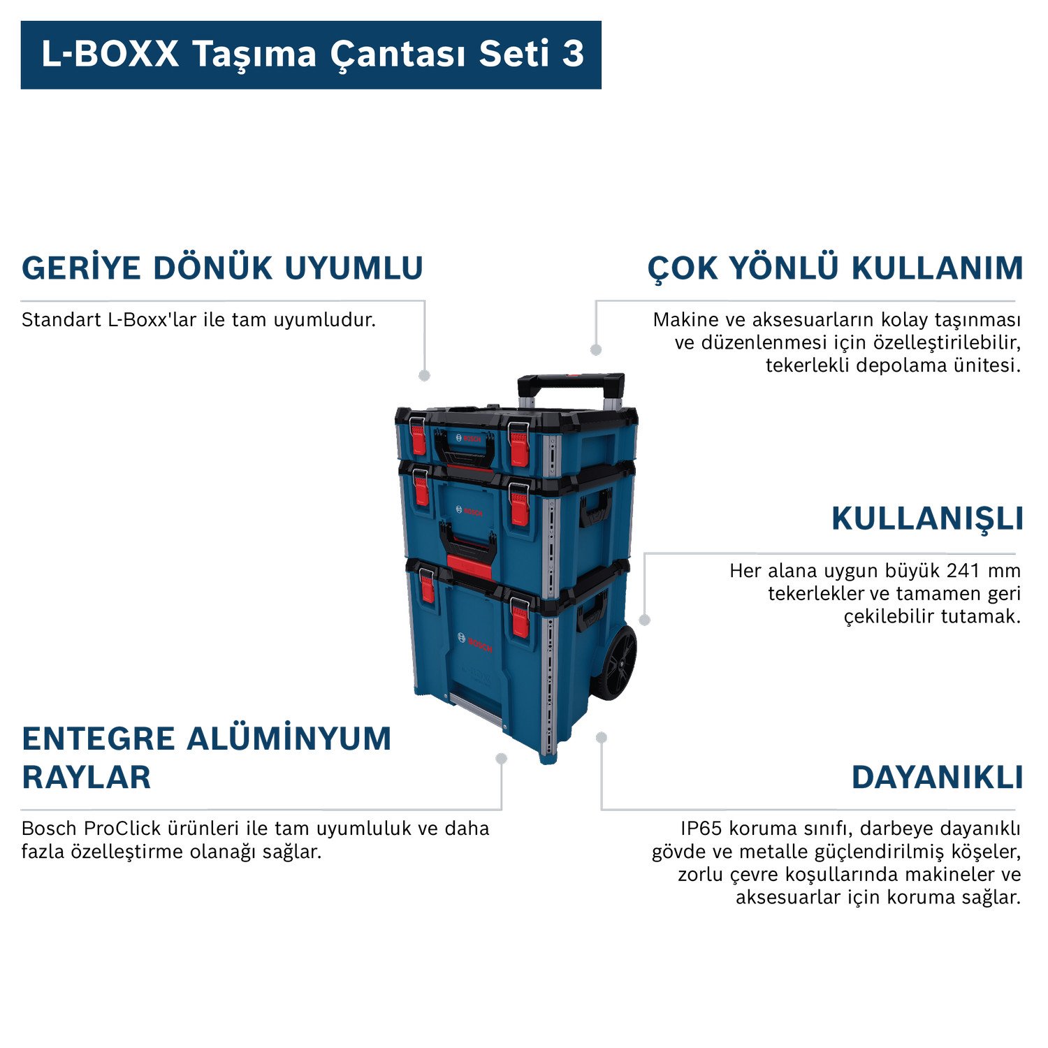 - L-BOXX Taşıma Arabası Seti 3, ProClick ürünlerinin takılması için entegre alüminyum raylara sahiptir. Tüm L-BOXX Taşıma Arabası ürünleri, önceki standart L-BOXX’lar ile uyumludur.